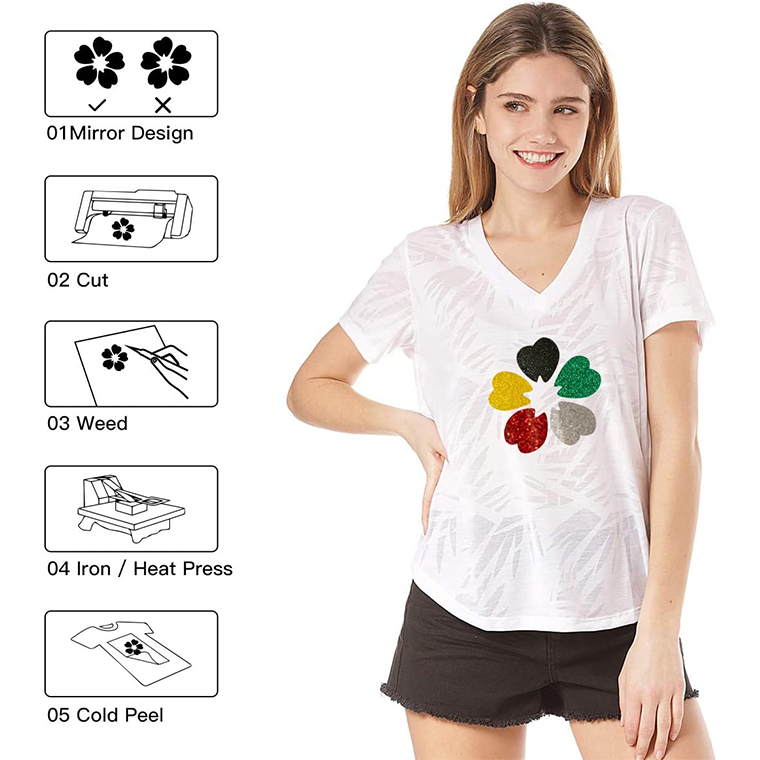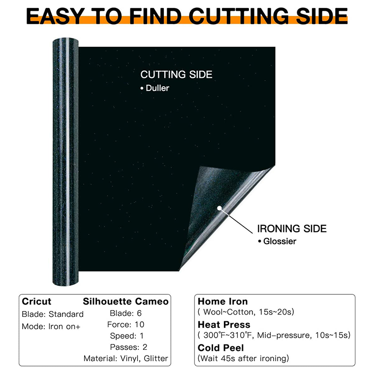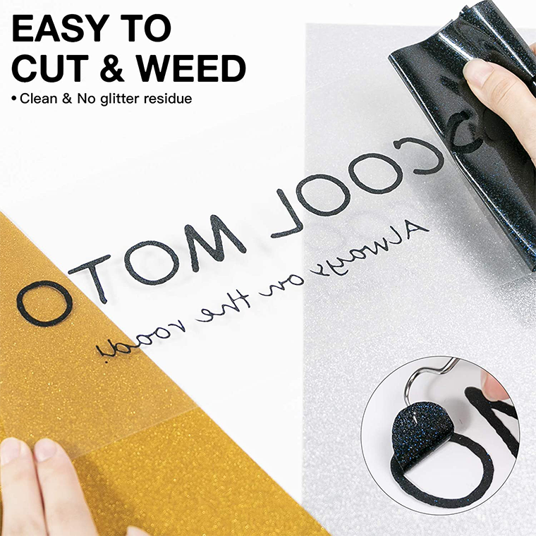 The glitter htv is thick with an excellent cutting application characteristics, any cutters’ blade can cut it through easily. The medium tack transfer film makes weeding like a dream, the glitter heat transfer vinyl is extremely sensitive to heat and pressure makes transfer quickly, which you will save your time. The glitter iron on vinyl is sensitive to temperature and pressure, which can be heat transferred on any t-shirt easily.Our glitter htv vinyl rolls is pretty sticky, they adhere to the fabric seamlessly and has held up well in the wash without fading, peeling and crack.Your designs of our black glitter heat transfer vinyl will keep the same color and can’t come off even after repeated washing cycles.Your shirt, tote bags, sportswear, aprons, hat and pillow, which used our black glitter htv, make you stand out from the crowd. Black htv are suitable for athletic mesh fabrics, Cotton, polyester and cotton blend, lycra/spandex, textiles etc.Our black glitter htv vinyl materials are SGS certified eco-friendly and are safe to wear.